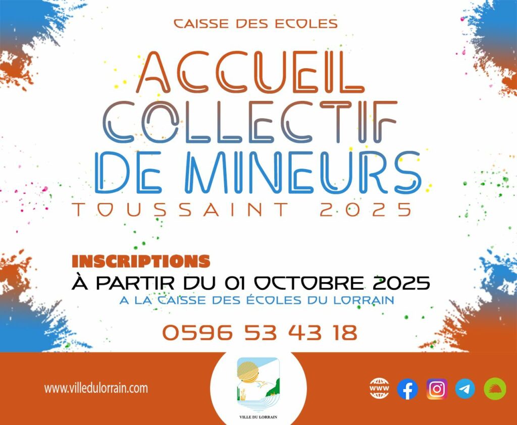 La ville du Lorrain informe les parents de l’ouverture des inscriptions de l’ACM Toussaint pour les enfants âgés de 3 à 12 ans, pour la période du 20 au 31 Octobre 2025.
