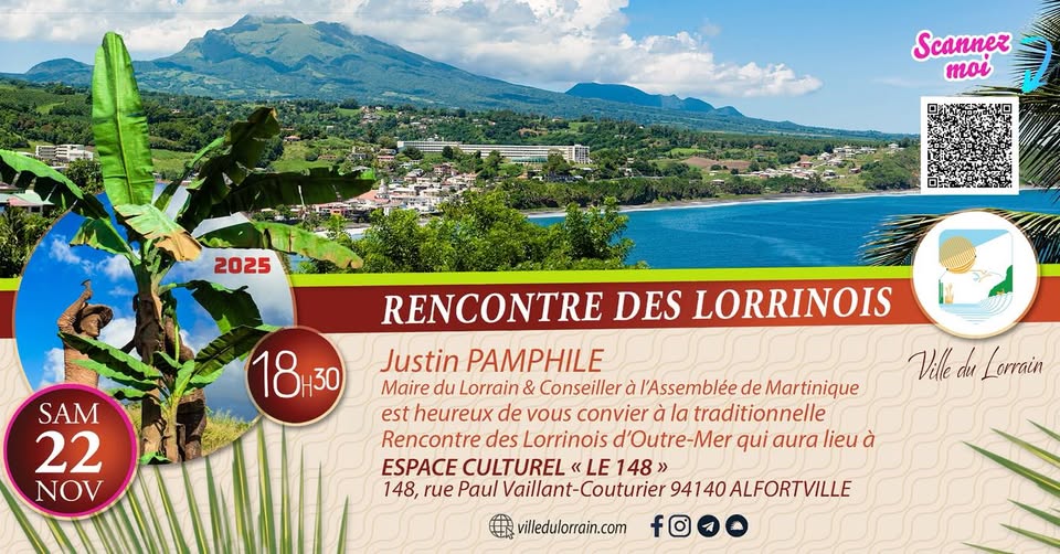 RENCONTRE DES LORRINOIS 2025 Justin PAMPHILE Maire du Lorrain & Conseiller à l’Assemblée de Martinique est heureux de vous convier à la traditionnelle Rencontre des Lorrinois d’Outre-Mer qui aura lieu à le SAMEDI 22 NOVEMBRE 2025 18h30 à l’ESPACE CULTUREL « LE 148 » 148, rue Paul Vaillant-Couturier 94140 ALFORTVILLE Pour vous y rendre scanner […]